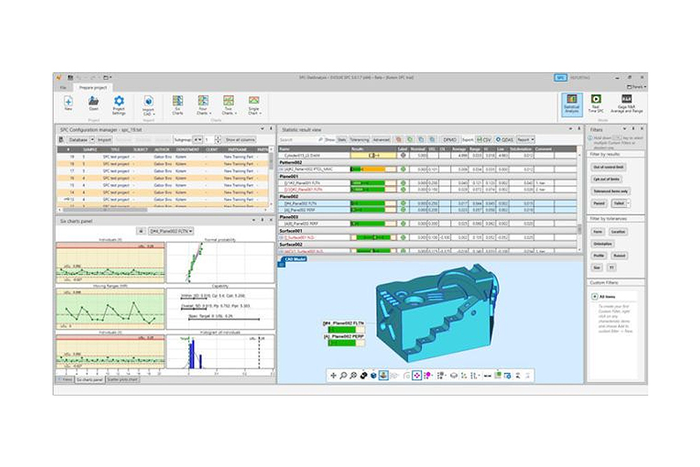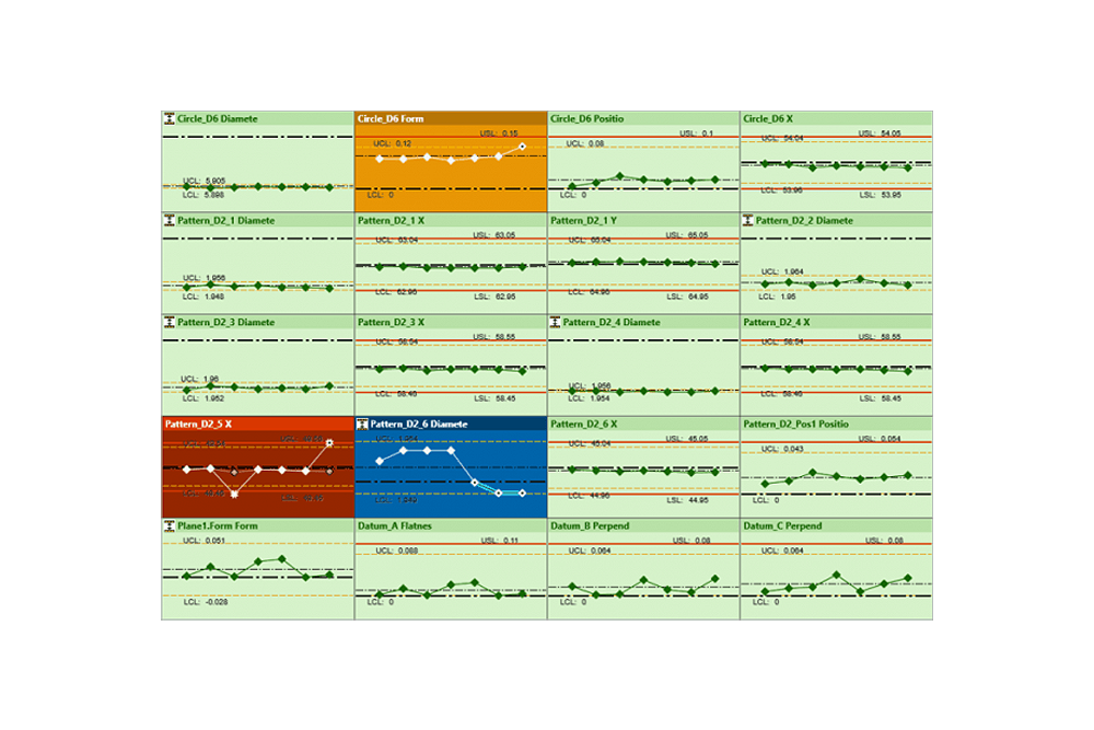 Statistical information is presented in interactive charts and feature characteristics are easily connected to the CAD model to clearly identify them. Analyze your data on I-MR, Xbar-R or Xbar-S charts or use one of twenty available customizable charts.